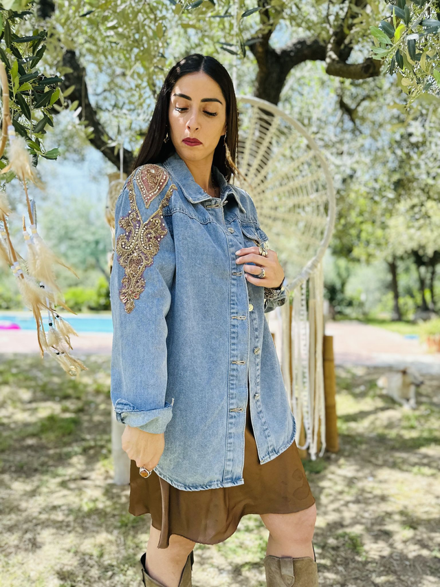 Lasciati conquistare dall’unicità di questa giacca in denim oversize, impreziosita da autentici sari indiani antichi restaurati. Ogni pezzo è unico, realizzato a mano con tessuti recuperati e rigenerati, che raccontano storie di tradizione e bellezza artigianale. Il denim robusto si fonde con i colori e i ricami tipici dei sari vintage, creando un contrasto affascinante tra stile urbano e cultura orientale. Taglia unica dal fit ampio, ideale per un look moderno, comodo e pieno di personalità. Perfetta per chi ama la moda etica, la sostenibilità e i capi che non passano inosservati.