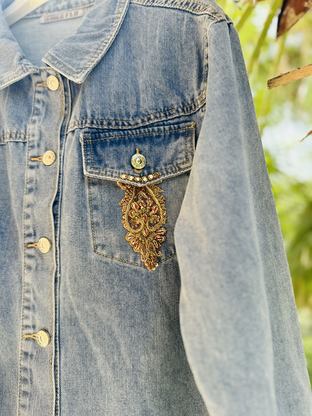 Giacca in denim oversize con sari antichi restaurati – Tradizione indiana e stile contemporaneo