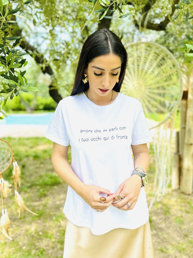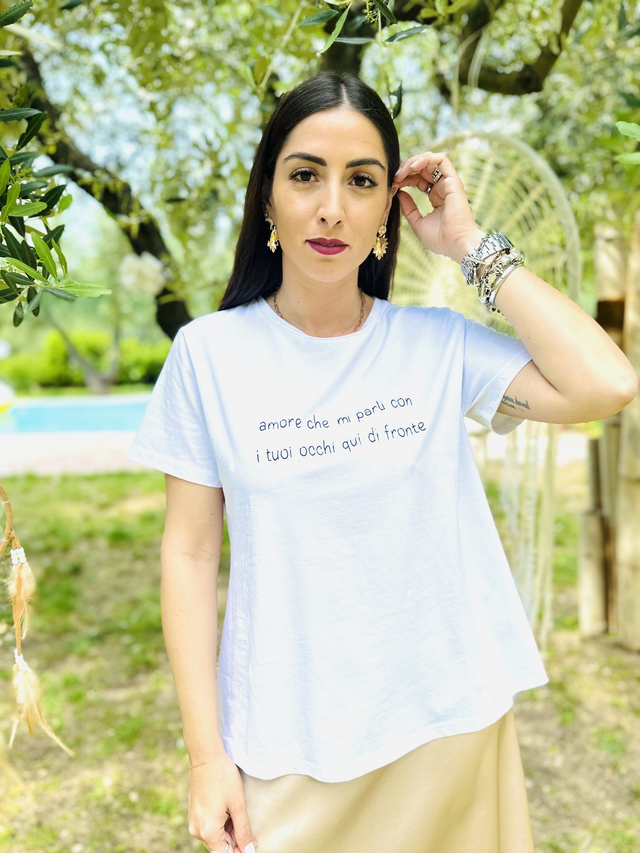 T-shirt “AMORE CHE MI PARLI CON I TUOI OCCHI QUI DI FRONTE” 100%COTONE.